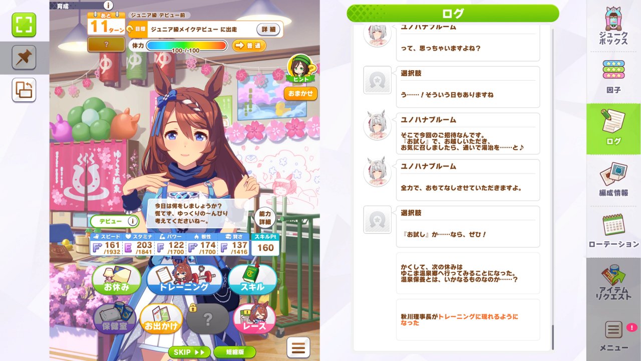 スマホの縦画面が左として表示されて、育成中とか右にログとか、選択肢の内容が表示される。
