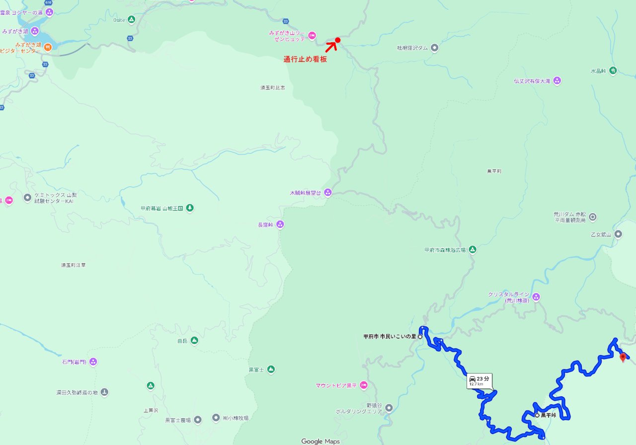 「黒平集落」から、「通行止申請箇所」の左端は、恐らく「甲州市 市民いこいの里」の右側あたり。